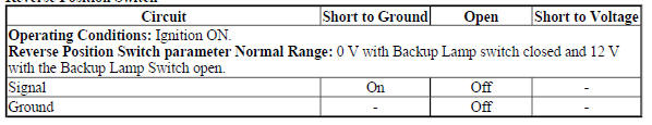 The Backup Lamp (Reverse Position) switch is a two wire switch mounted on the transmission assembly. The Backup Lamp switch is connected to a 12 V signal circuit from the engine control module (ECM). The ground circuit is connected to chassis ground. The Backup Lamp switch is a normally open switch. The voltage on the Backup Lamp switch signal circuit to the ECM is HIGH when the switch is open and the transmission is in Neutral or another forward gear. The voltage on the Backup Lamp switch signal circuit to the ECM is LOW when the switch is closed and the transmission is in the reverse position. When the transmission is placed in the reverse position, the ECM sends a serial data message to the Body Control Module (BCM). The message indicates that the gear selector is in the reverse position. The BCM applies battery voltage to the backup lamps.