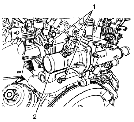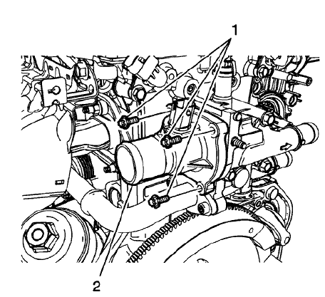 - Install the thermostat (2) and tighten the thermostat bolts (1) to 10