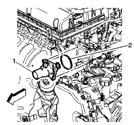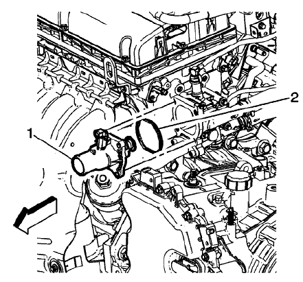 - Fit the thermostat (1) to the thermostat housing using a NEW seal (2).