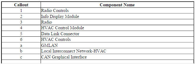 The HVAC controls are a separate component from the radio controls. HVAC data for controls and status indicators is communicated between the HVAC controls and the HVAC control module with a separate LIN serial data circuit. HVAC status screen information from the HVAC control module is transmitted to the radio on the GMLAN serial data circuit. The radio then displays the desired screen information on the info display using the video data circuits.